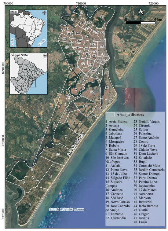 Aracaju is located at geographic coordinates approximately −10.9472 latitude and −37.0731 longitude (Figure 1). The city covers a territorial area of 182.163 km2, with a resident population of 602,757 people and a population density of 3308.89 inhabitants per km2 [35].