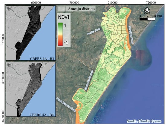 Spatial distribution of the Normalized Difference Vegetation Index (NDVI) within the Municipality of Aracaju, Sergipe, Brazil. This map illustrates the variability of vegetation cover across Aracaju, derived from satellite imagery. The main panel presents the calculated NDVI values, ranging from −1 to +1, where higher positive values (green tones) indicate dense, healthy vegetation, and lower values (red/orange tones) represent areas with sparse vegetation, bare soil, or water bodies. The municipal boundaries and district divisions (“Aracaju districts”) are overlaid to provide geographical context. The Sergipe, Poxim, and Santa Maria Rivers, along with the Vaza Barris River, are also indicated, influencing the local vegetation patterns. The two inset maps on the left display the raw satellite imagery bands CBERS 4A-B4 (Near-Infrared) and CBERS 4A-B3 (Red), which were utilized in the computation of the NDVI, thereby demonstrating the primary data source for the index derivation. All spatial data presented in this map are referenced to DATUM SIRGAS 2000, in the UTM coordinate system, Zone 24S.
