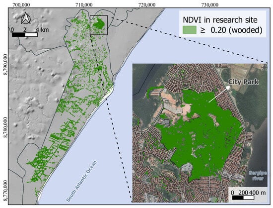 Distribution of vegetal cover in the municipality of Aracaju, Sergipe, Brazil, obtained through NDVI and Urban Area Mask. This map illustrates the application of the “streets and recreational areas” layer as a mask to refine the Normalized Difference Vegetation Index (NDVI) analysis within the public areas of the municipality of Aracaju. The main panel (left) highlights, in green, areas classified as “wooded,” corresponding to pixels with NDVI values equal to or greater than 0.20. This filtering allows for the visualization of regions with higher arboreal vegetation density within the urban environment. The inset map (right) provides an enlarged detail of the City Park region, evidencing the concentration of tree cover within an urban recreational area. All spatial data presented in this map are referenced to DATUM SIRGAS 2000, in the UTM coordinate system, Zone 24S.