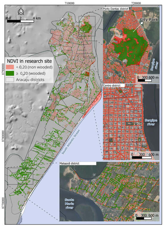 Classification of arboreal and non-arboreal cover in the study areas of Aracaju Municipality, Sergipe, Brazil. This map details the spatial distribution of vegetation cover, categorized based on Normalized Difference Vegetation Index (NDVI) values within public areas and areas of interest for the urban tree census. Areas classified as “wooded” are represented in green, indicating pixels with NDVI ≥ 0.20. In contrast, “non-wooded” areas, shown in red, correspond to pixels with NDVI < 0.20, suggesting a lack of dense vegetation or the presence of other surfaces (bare soil, buildings, etc.). The main panel presents the general distribution for the municipality, with the overlaid “Aracaju districts” boundaries. Three inset maps provide an enlarged detail of representative districts: Porto Dantas (upper right), Centro (middle right), and Matapoã (lower right), illustrating the variability of vegetation cover in different urban and peri-urban contexts and the impact of research area delimitation. All spatial data presented in this map are referenced to DATUM SIRGAS 2000, in the UTM coordinate system, Zone 24S.