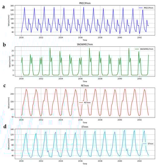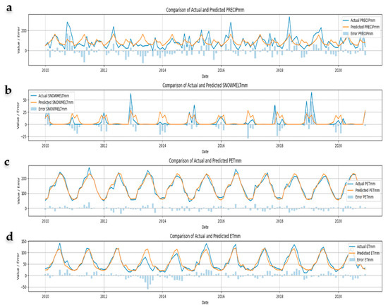 - Precipitation and snowmelt showed higher variability and were less accurately predicted (RMSE = 30–50 mm and 5–10 mm, respectively).