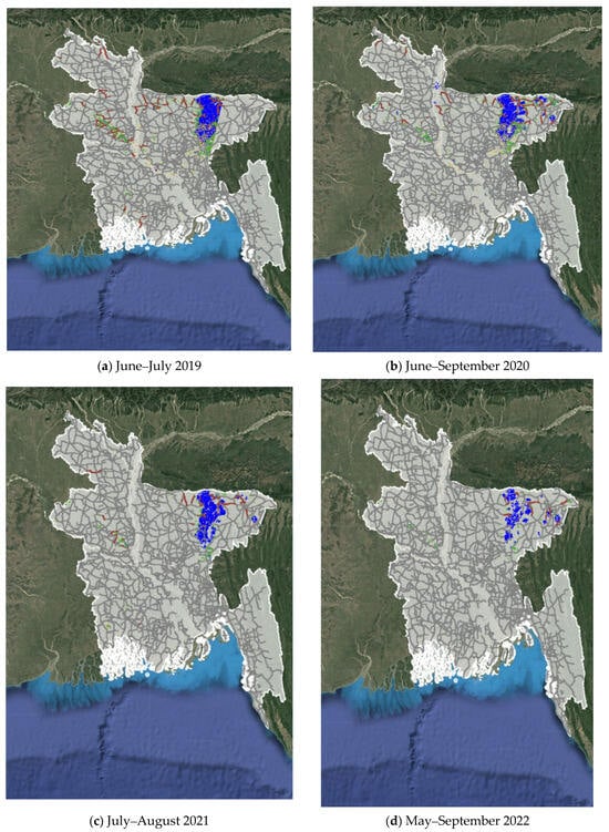 Based on location, the road was most affected in the Sylhet and Dhaka-Mymensingh divisions (Table 4). The roads of Sylhet and the Dahak-Mymensingh divisions were affected the most. In 2020 and 2023, Sylhet division’s road length was around 455 and 292 km. In the rest of the floods in this division, the affected road range was within 150 to 200 km. Dhaka-Mymensingh division roads were highly affected during the 2019 flood, with 470 km. In 2020, around 300 km of roads were affected in this division. The roads of Rajshahi and Chattogram were also affected by floods. The other divisions (i.e., Khulna, Barishal) were affected significantly by the 2023 flood. The roads of the Rangpur division remained less affected than those of other divisions during this period.