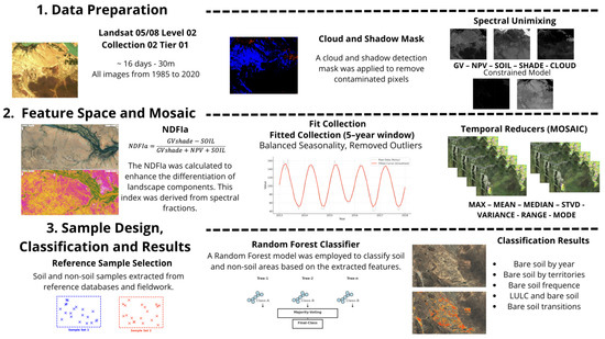 After classification, a masking process was applied to remove urban areas using the MapBiomas dataset. A frequency filter was applied to improve classification consistency, removing areas classified as exposed soil for five years or less throughout the time series. Additionally, a temporal filter with a 3-year window was implemented, where the classification of the middle year was adjusted to match the dominant class of the preceding and succeeding years. These post-processing steps ensured a more stable and reliable identification of persistent bare soils, minimizing short-term classification inconsistencies and reducing noise in the final dataset.