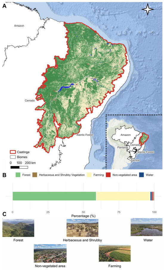 Location map of the Caatinga biome. (A) Geographical context of the Caatinga and Land Use and Land Cover (LULC) map. (B) LULC chart, based on MapBiomas Collection 9, presents the dominant categories: Forest, Herbaceous and Shrubby Vegetation, Farming, Non-vegetated Areas, and Water Bodies. (C) Field images representing LULC provide visual examples of the landscape characteristics across the Caatinga biome. LULC data shown in this figure were derived from MapBiomas Collection 8, the most recent version, to provide a current overview of the study area.