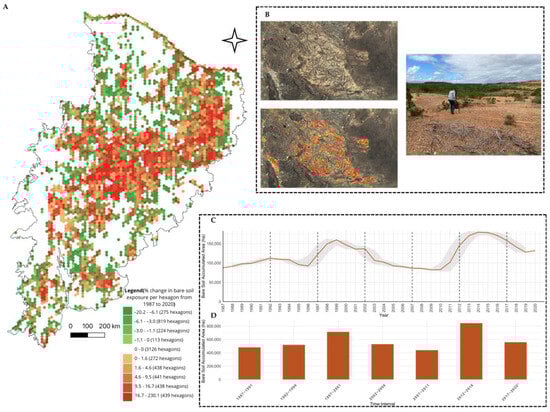 Figure 3 provides an overview of these patterns, illustrating areas with increased and decreased soil exposure over time. To generate the spatial representation (Figure 3A), the annual rate of soil exposure change was calculated for each hexagon, followed by an average of these values across the study period. The spatial distribution highlights regions where soil exposure has intensified, while the temporal analysis identifies specific periods of more significant change. The data are presented in different panels, showing spatial trends (Figure 3A), examples through remote sensing and field observations (Figure 3B), a time series of bare soils (Figure 3C), and aggregated data in five-year intervals (Figure 3D).