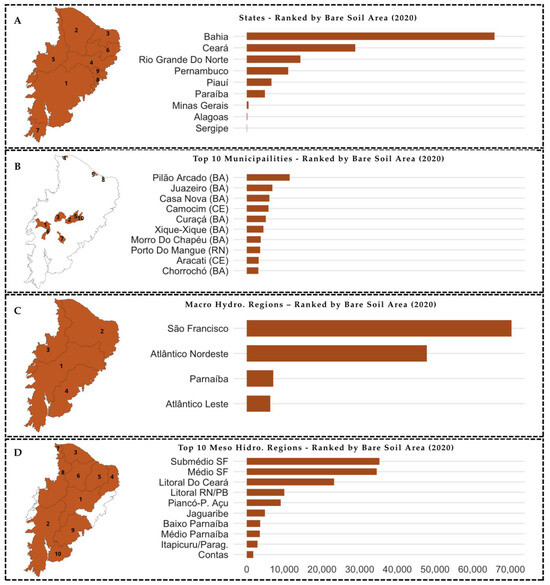 The ranking of bare soil areas in 2020 highlights significant spatial patterns across different territorial divisions (Figure 4). Figure 4A presents the ranking by state, showing that Bahia had the largest occurrence area, totaling 65,734 ha, followed by Ceará (28,799 ha) and Rio Grande do Norte (14,273 ha). Pernambuco and Piauí also showed considerable areas of bare soil, with 10,996 ha and 6586 ha, respectively. The states with the smallest areas were Minas Gerais, Alagoas, and Sergipe.