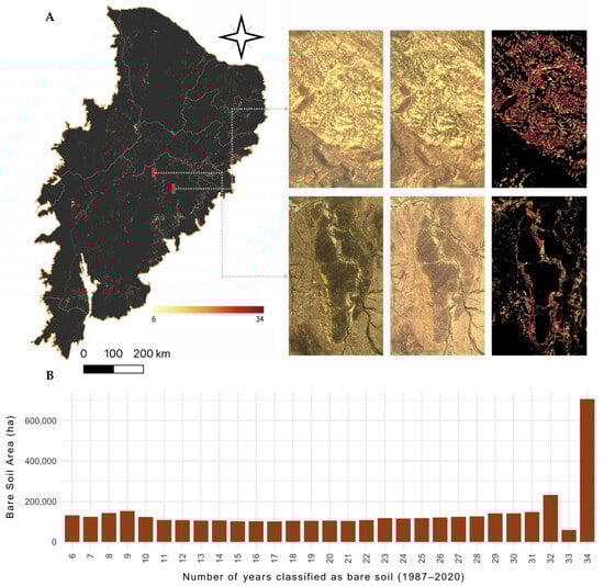 Figure 5B presents a histogram of accumulated bare soil area by frequency values, showing that most pixels were classified as bare soil between six and seventeen times during the study period, with values ranging from 101,314 ha to 152,345 ha. However, a sharp increase is observed in pixels classified as bare soil more than 32 times, reaching a peak of 706,019 ha for the highest frequency category (34 occurrences). This suggests that a substantial portion of the exposed soil is recurrent, emphasizing long-term degradation trends.
