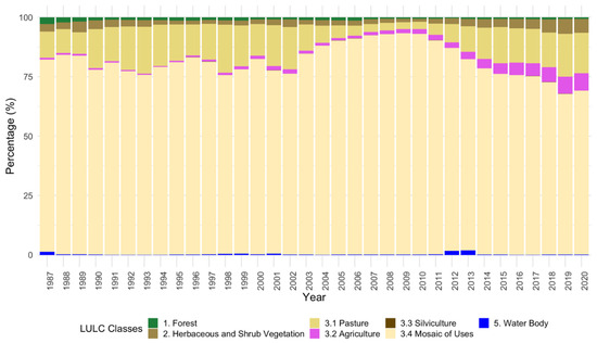 The analysis of land use and land cover (LULC) conversion to bare soil reveals distinct patterns over time. Figure 6 shows the percentage of each LULC class converted into bare soil each year by comparing the bare soil area with the land cover class from the previous year. The results indicate that the Mosaic of Uses (3.4) is the predominant contributor to soil exposure, consistently representing a significant portion of conversions across the entire period. Pasture (3.1) also plays a major role, maintaining a stable share over time, while Agriculture (3.2) becomes increasingly relevant, particularly after 2010.