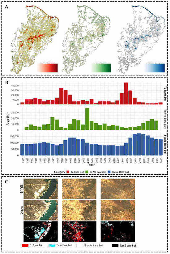 The annual transitions in bare soil dynamics are detailed in Figure 7B, which presents three bar charts. The first chart (red) represents areas transitioning to bare soil, with peaks exceeding 46,685 ha, particularly in the mid-1990s and early 2010s. The second chart (green) shows areas transitioning to no bare soil, reaching 37,962 ha in some years. The third chart (blue) represents stable bare soil areas, which remained consistently high throughout the period but increased notably after 2010, reinforcing the persistence of soil exposure in specific regions.