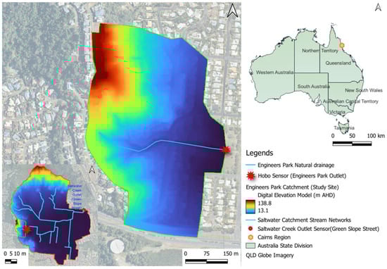 The selected study site is Engineers Park, a small sub-catchment of the Saltwater Creek catchment in Cairns city, Queensland, Australia (Latitude = −16.911, Longitude = 145.72) (Figure 1). This site was previously used for the hydrodynamic study of floods in [34] and was also utilised in this study to expand the research scope to include climate change. This catchment has a total area of 0.27 km2, a small fraction of the Saltwater Creek catchment, which spans a total area of 16 km2. The catchment is topographically characterised by a short width of approximately 600 m and a significant elevation difference, ranging from about 11 m Australian Height Datum (AHD) at the outlet to 139 m AHD at the top.