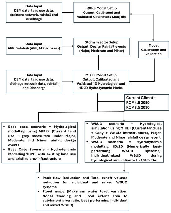 Therefore, to bridge the research gap, this study focuses on understanding the integration of WSUD with grey measures for reducing localised flooding induced by climate change in a tropical catchment. To understand these issues, the following research questions were posed: (i) What is the likely impact of climate change on localised flooding? (ii) Can WSUD measures contribute to flood mitigation after integration with existing grey infrastructure under climate change? (iii) What factors affect WSUD application in the tropics under climate change?