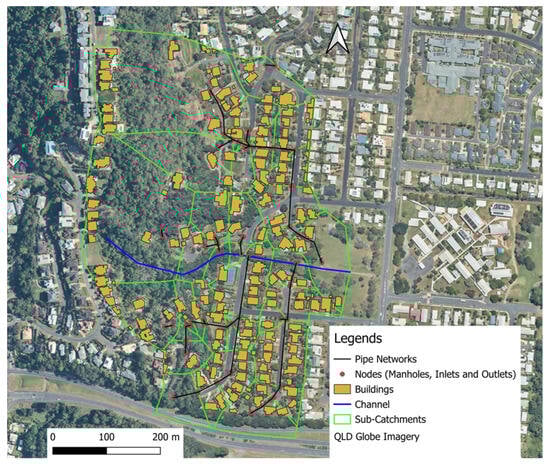 Engineers Park is the uppermost sub-catchment of Saltwater Creek, located on the western side of the Whitfield range. This study site is a perfect example for evaluating the performance of existing grey measures and the impact of WSUD measures. The assessment of WSUD in such a topography can yield several significant findings, including the impact of slope on flooding and the application of WSUD, as well as the spatial prioritisation of these measures. Comprehensive flood modelling was undertaken at a small spatial scale, focusing on understanding rainfall-driven localised flooding at this study site, before the simulation work was expanded to the entire catchment. Generally, upstream and mid-catchment areas have a significant influence on the amount of runoff attributed to the drainage network and substantially affect the overall catchment flooding [35]. Additionally, while the study area is a steep catchment, the catchment slope has less significance in inducing flood generation during small-sized rainfall events. The flooding problem is influenced by localised changes within the catchments, such as the underperformance of grey measures. Therefore, the intervention of WSUD measures within the catchment can be evaluated, which can significantly reduce the runoff transported to the grey measures and can have a positive impact on reducing the flood hazard.