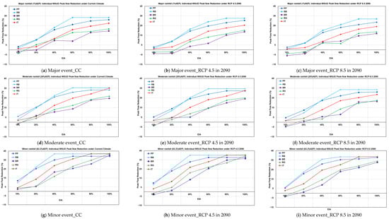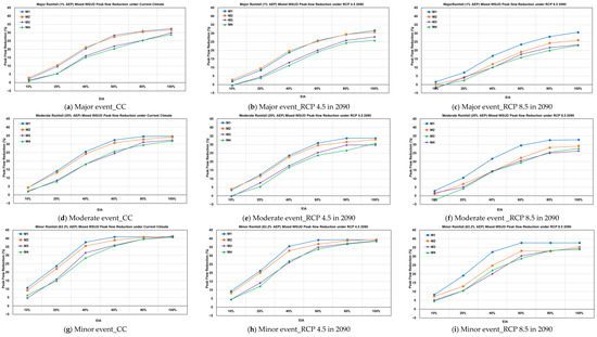 Peak flow reduction with mixed WSUD performance under (a) Major event_CC, (b) Major event_RCP 4.5 in 2090, (c) Major_RCP 8.5 in 2090, (d) Moderate_CC, (e) Moderate_RCP 4.5 in 2090, (f) Moderate_RCP 8.5 in 2090, (g) Minor_CC, (h) Minor_RCP 4.5 in 2090, and (i) Minor_RCP 8.5 in 2090.