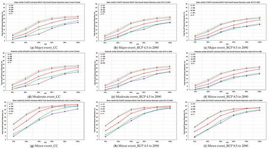 Total runoff volume reduction with individual WSUD performance under (a) Major event_CC, (b) Major event_RCP 4.5 in 2090, (c) Major event_RCP 8.5 in 2090, (d) Moderate_CC, (e) Moderate_RCP 4.5 in 2090, (f) Moderate_RCP 8.5 in 2090, (g) Minor_CC, (h) Minor_RCP 4.5 in 2090, and (i) Minor_RCP 8.5 in 2090.