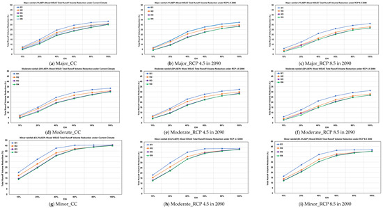 Total runoff volume reduction with mixed WSUD performance under (a) Major event_CC, (b) Major event_RCP 4.5 in 2090, (c) Major event_RCP 8.5 in 2090, (d) Moderate_CC, (e) Moderate_RCP 4.5 in 2090, (f) Moderate_RCP 8.5 in 2090, (g) Minor_CC, (h) Minor_RCP 4.5 in 2090, and (i) Minor_RCP 8.5 in 2090.