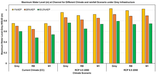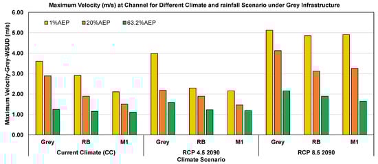The maximum velocity variation at the channel outlet under different rainfall and climate scenarios ranged from 1 to 3.5 m/s under current conditions and up to 5 m/s under RCP 8.5 by 2090, indicating a potential 40% increase due to intensified rainfall (Figure 9). While velocity is less discussed in the literature compared to inundation or the water level, it is critical for assessing the flood hazard. The increase is attributed not only to greater runoff but also to the steep upper catchment and grey infrastructure. In contrast, effective WSUD measures like rain barrels and M1 significantly reduced velocities by 4–48%, particularly under major and moderate rainfall events. High velocities pose safety risks, transporting debris and increasing flood damage potential, even during minor events.