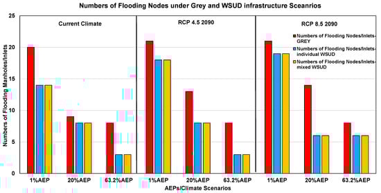 The number of flooded nodes under different climate scenarios and rainfall conditions varied notably with the integration of WSUD (Figure 10). Under RCP 8.5 in 2090, flooded nodes increased by up to 33% and 62% during moderate and minor events, respectively, due to higher rainfall and runoff. However, WSUD implementation led to a reduction in flooded nodes by up to 30% (current climate) and 57% (RCP 8.5) during moderate events, and up to 62% and 25% under minor events, respectively (Figure 10). The data suggest that WSUD is most effective in reducing node flooding during moderate and minor rainfall, while its impact is limited under major events.
