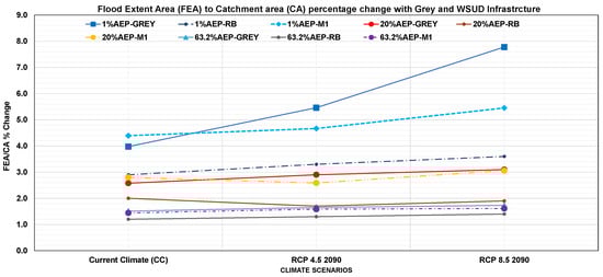 The flood extent area-to-catchment area (FEA/CA) ratio, ranging from 1% to 8% across scenarios, serves as a key indicator of flood mitigation efficiency (Figure 11). A sharp increase in this ratio was observed during major rainfall under future climate scenarios (RCP 4.5 and 8.5 in 2090), while it remained relatively stable during minor and moderate events (Figure 11). WSUD integration significantly improved runoff management by intercepting direct flows from impervious surfaces and routing them to inlets, effectively reducing flooded nodes, overland flow, and inundation depths. Overall, WSUD reduced the FEA by 22–26% under the current climate and by 18–54% under RCP 8.5 in 2090, with the most notable reductions during major rainfall events.