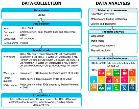 The resulting query was introduced in Scopus, and it is TITLE-ABS-KEY (“water treatment” OR “waste water treatment”) OR TITLE ((water OR waste water) AND (drink* OR potable OR recycl* OR quality OR reuse)) OR AUTHKEY ((water OR waste water) AND (drink* OR potable OR recycl* OR quality OR reuse OR analy*)). Next, the resulting query was narrowed down, limiting the document type to articles, conference proceedings, reviews, book chapters, and books. Afterward, 2023 was established as the final year of publication, and Mexico was selected as the country of interest. The data collection and analysis methodology is shown in Figure 1.