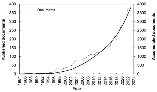 Figure 2 shows the history of publications related to the topic of interest and how the publications have accumulated over the 40 years of this bibliometric analysis. During the first 20 years of publications, there was a maximum of 81 documents published annually (2005), while during the second half of the period, a maximum of 379 was reached (2022). Although the production of documents has been variable over the years, it is observed that there is a sustained upward trend, which has an exponential trend. However, 2023 had fewer documents than the year before, which had the highest production (2022).
