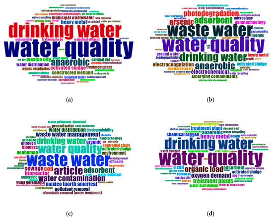 As can be seen, the words water quality and drinking water appear in all four images, representing the frequency and relevance of the topic. This reflects the Mexican research trend around water quality monitoring and its assurance. In general, the rest of the words that appear in the clouds are more related to research on waste water treatment, with words such as waste water and anaerobic standing out. This suggests a broader research focus on water sanitation, a critical area in many countries such as Mexico, where eliminating contaminants from waste water is a growing priority involving both governmental efforts and the academic community.