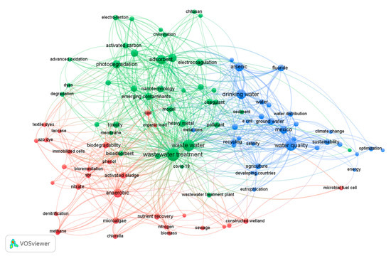 On the other hand, waste water treatment, waste water, adsorbent, water treatment, and photodegradation were the most frequently found words in the green cluster. In this case, adsorption with different adsorbents and photodegradation were physicochemical processes applied to water and waste water treatment.