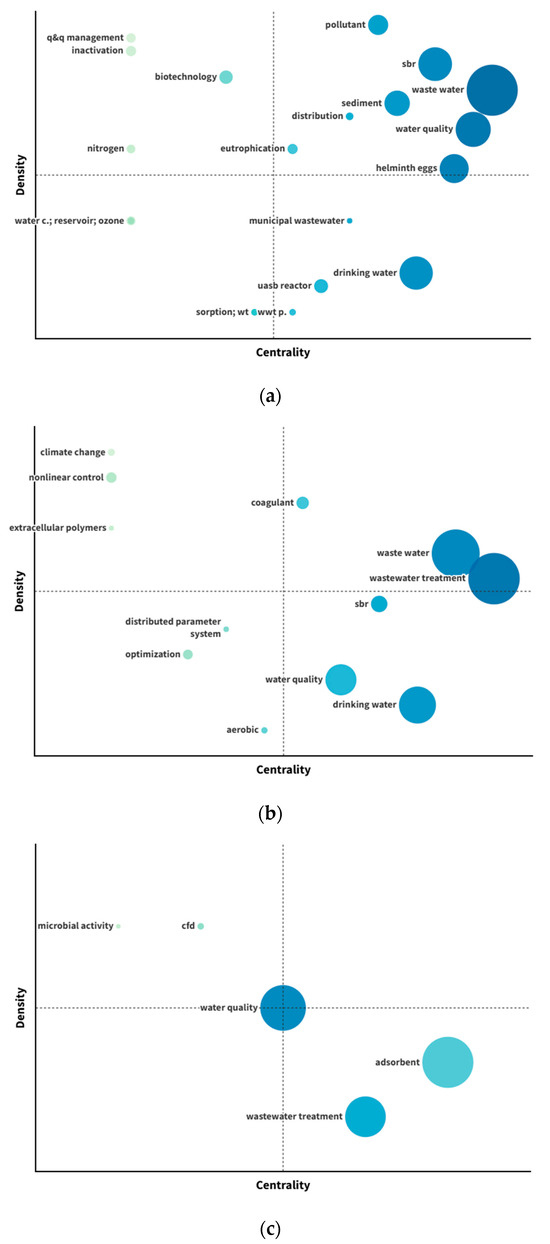 For the third period (2014 to 2023), in Figure 6c, the motor themes disappear, and the water quality cluster is positioned at the center of the quadrants with a medium density. Among the niche themes (upper left quadrant) during the three periods, the clusters varied from each other; namely, the specialized themes changed significantly over time. In the lower left quadrant, the less developed themes are found. The sorption cluster appears in this quadrant in the first period, and then it evolves towards the basic themes’ quadrant in the third period, similarly to the adsorbent cluster. The waste water treatment cluster also appears among the basic themes of this study period, which in the previous period was among the motor themes. Finally, it is observed that no marginal themes appeared in the third period, and only two niche themes were formed.
