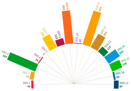The impact towards these objectives is expected, especially the contribution of those related to sustainable communities, sustainable resource consumption, and the importance of water treatment for people’s health. Likewise, it is natural to associate these documents’ contributions with improving water and land life. On the other hand, it was observed that the impact on the climate change objective (SDG 13) appears in ninth place on the list; this is lower than initially expected. Finally, these works seem to have a marginal impact on achieving the objectives related to gender equality, reduced inequalities, and quality education. This can be associated with the technical wording in these published documents rather than with the fact that these investigations do not impact such pertinent issues.
