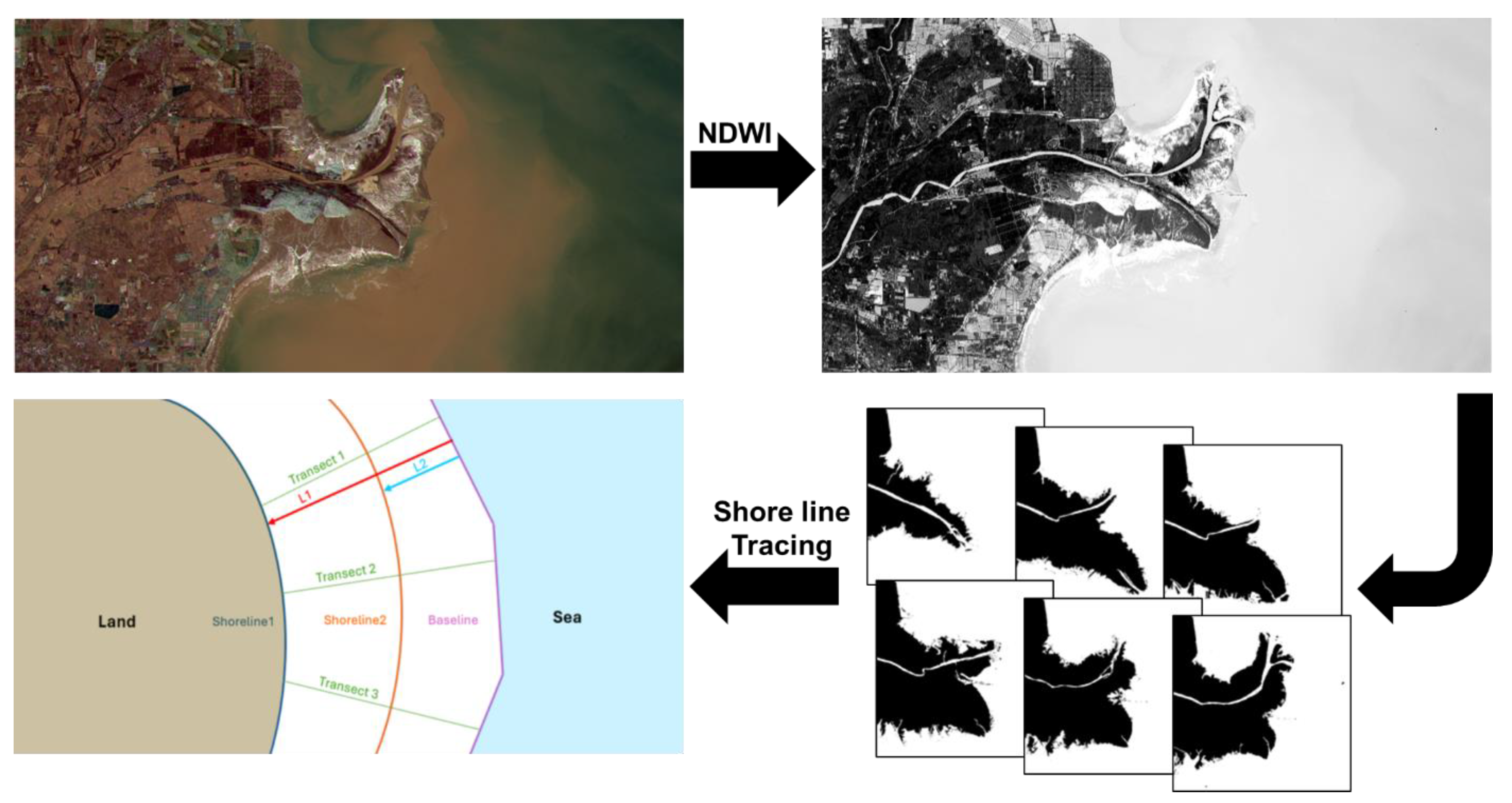 - Risha, M. Coastal Evolution of the Nile, Indus, and Yellow River Deltas: Historical Analysis, and Machine Learning Prediction for Future Shoreline. Master’s Thesis, NC State University, Raleigh, NC, USA, 20 August 2024. [Google Scholar]