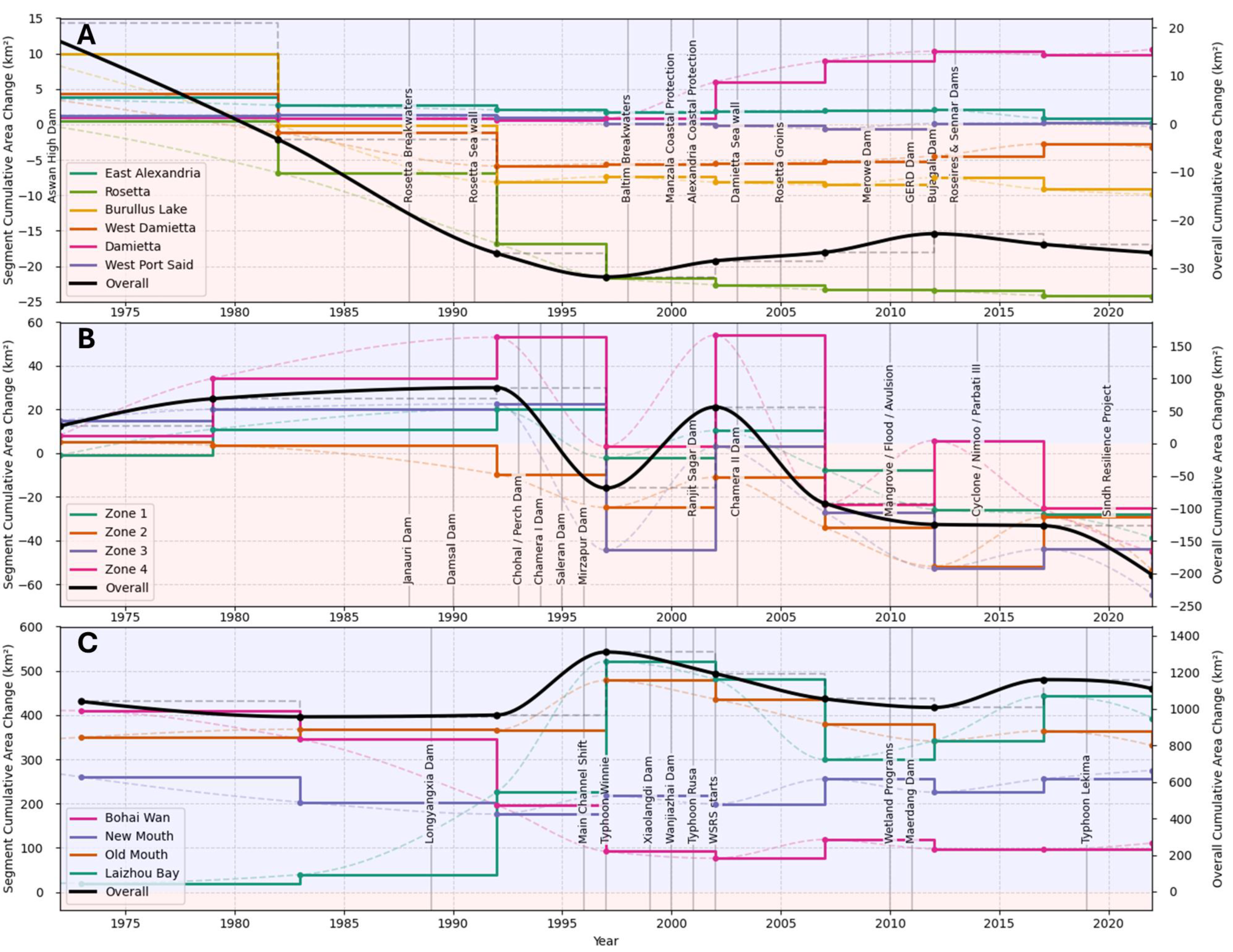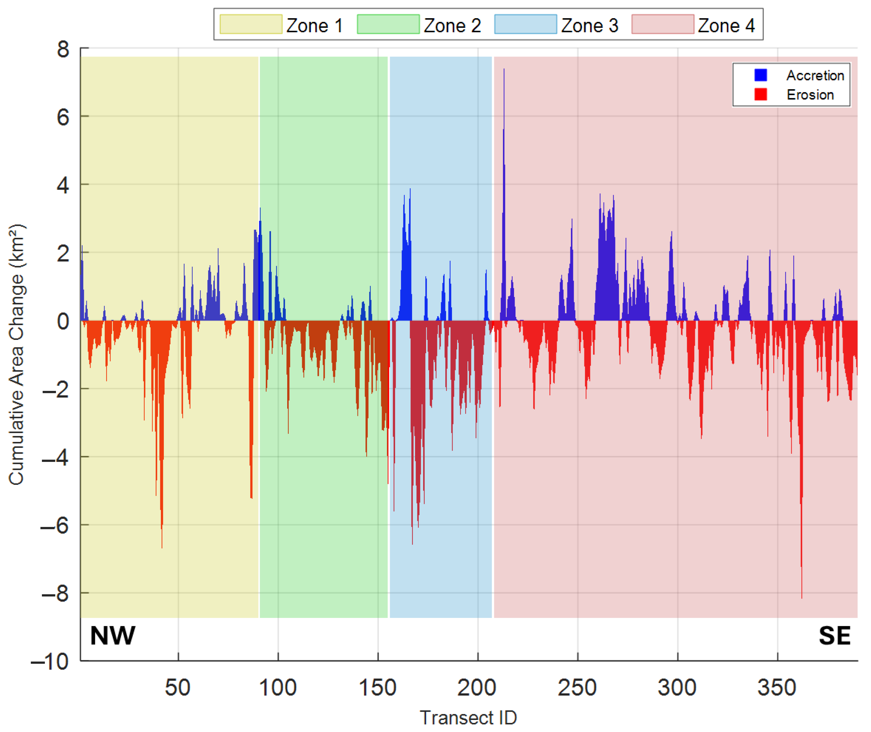 Segment | Total Area Change (km2) | EPR Trend (m/year) | Dominated Process |