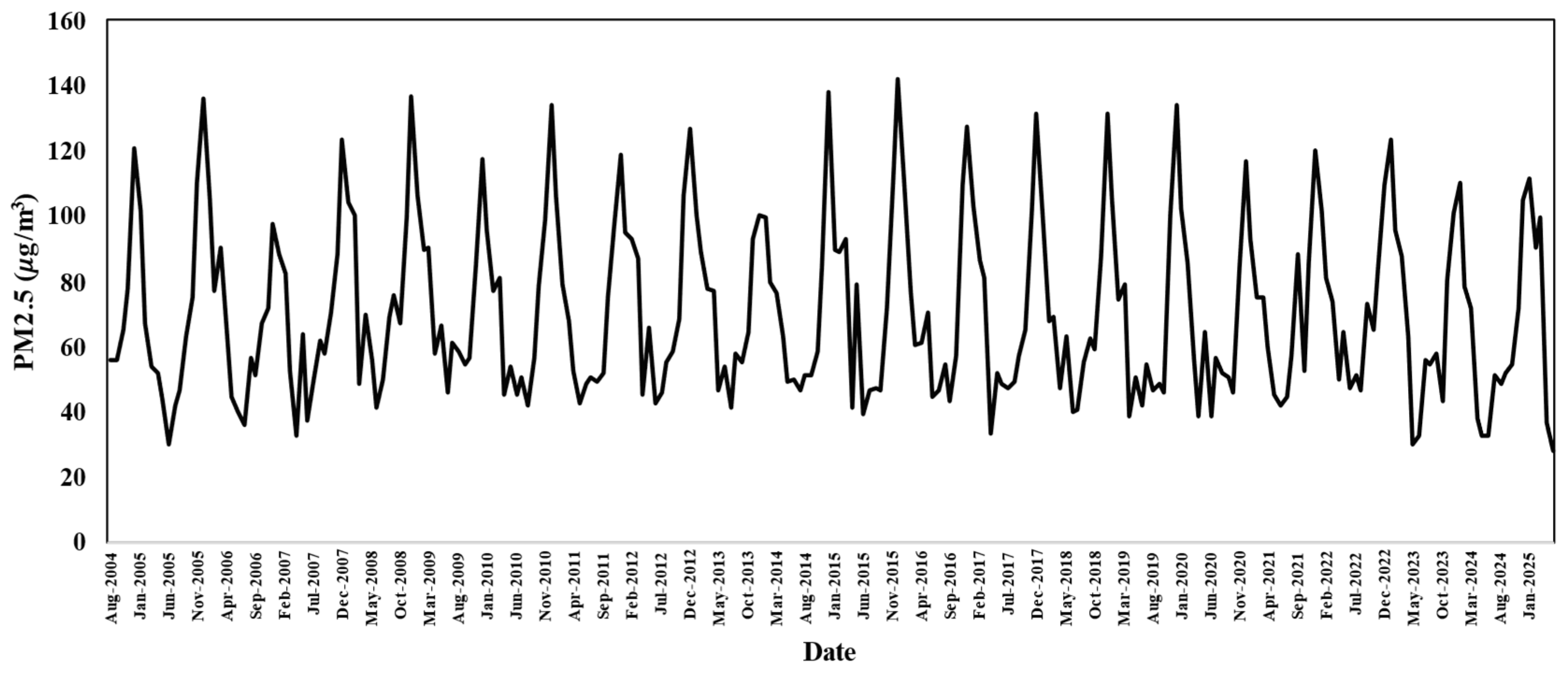 31]. Given these unique climatic and geographical features, Zabol represents an ideal natural laboratory for investigating the dynamics of particulate matter pollution and the performance of advanced forecasting models in extreme dust conditions. For this study, a monthly time series dataset of fine particulate matter (PM