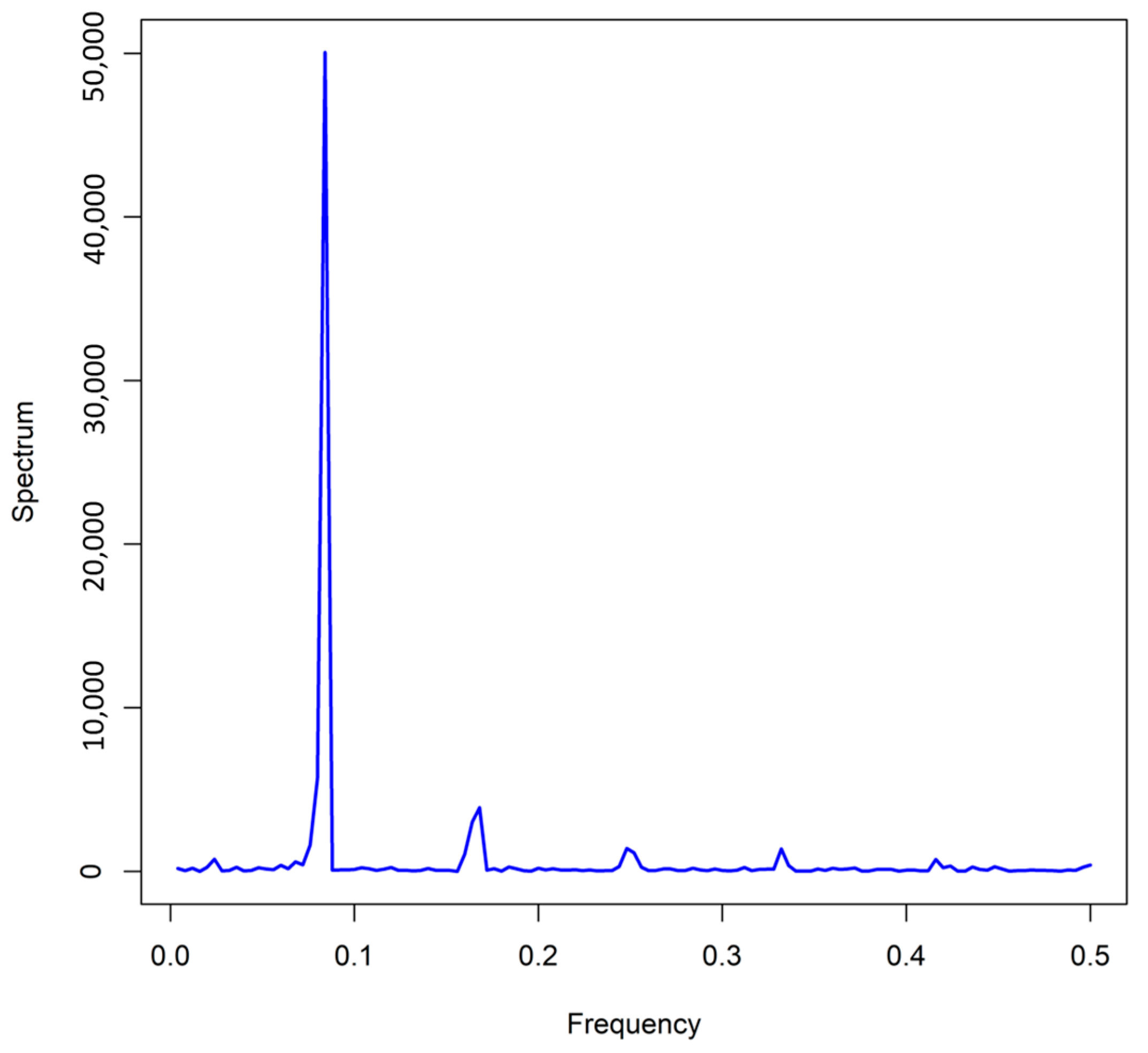 2.5 concentrations at Zabol station. The results reveal a dominant peak at a frequency of 0.083, corresponding to 12 months, indicating a strong annual seasonal pattern in the data. This finding aligns with previous observations of seasonal air pollution variations in the region. The absence of other significant peaks in the periodogram suggests no secondary cycles (such as semi-annual or short-term seasonal patterns) are present in the data. These results confirm the necessity of incorporating seasonal components, such as Fourier terms or SARIMA models, in subsequent analyses.