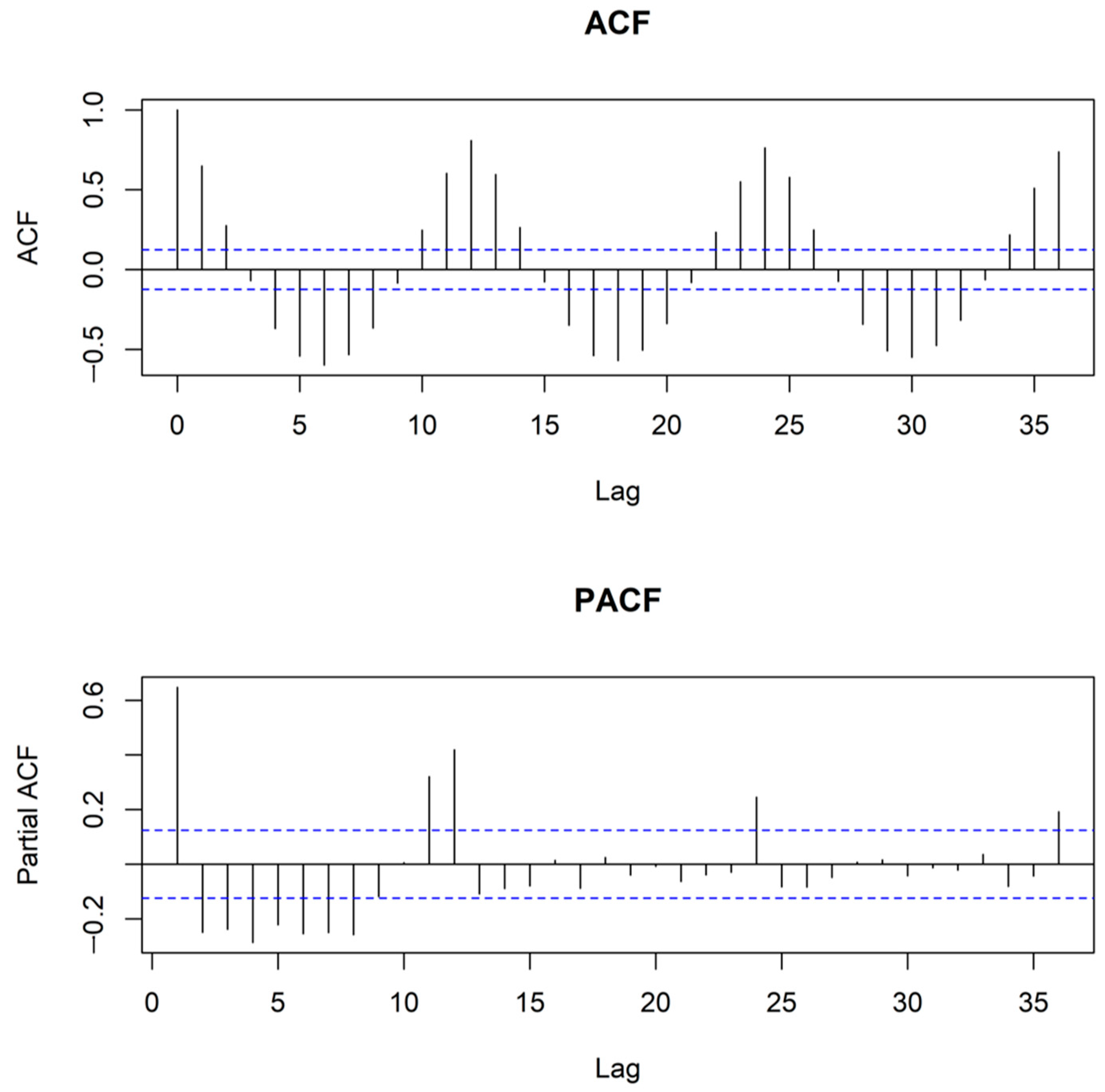 12], which effectively accounts for both the observed short-term dependencies through its non-seasonal terms and the strong annual seasonality through its seasonal components. This model structure is particularly suitable given the clear 12-month periodicity evident in both plots and the relatively simple non-seasonal pattern. The inclusion of first-order seasonal AR and MA terms (P = 1, Q = 1) appropriately captures the persistent seasonal effects while maintaining model parsimony.