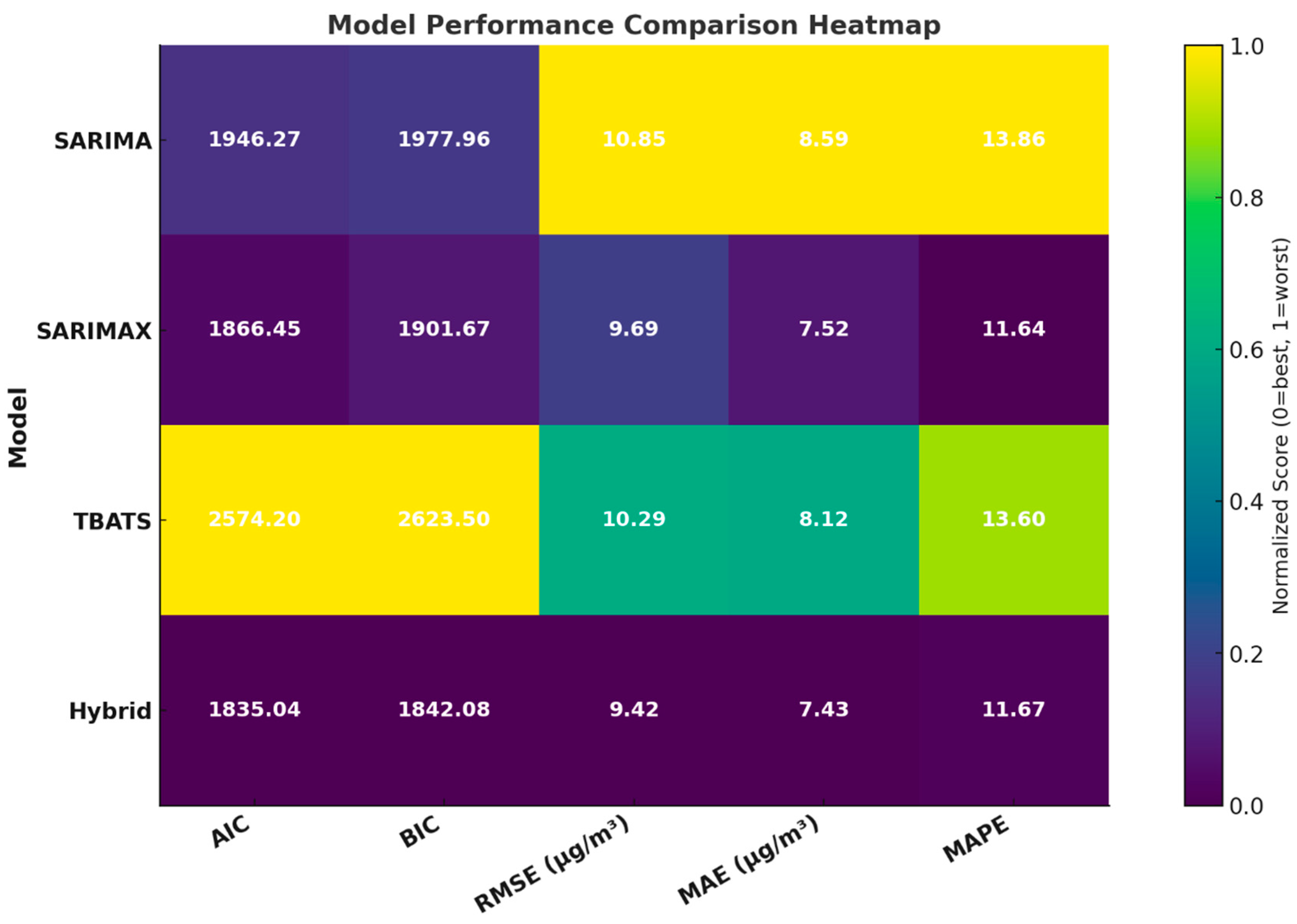 24] demonstrated its effectiveness for multi-seasonal environmental series. These contributions underscore the growing relevance of SARIMAX–Fourier models for environmental and air-quality forecasting.