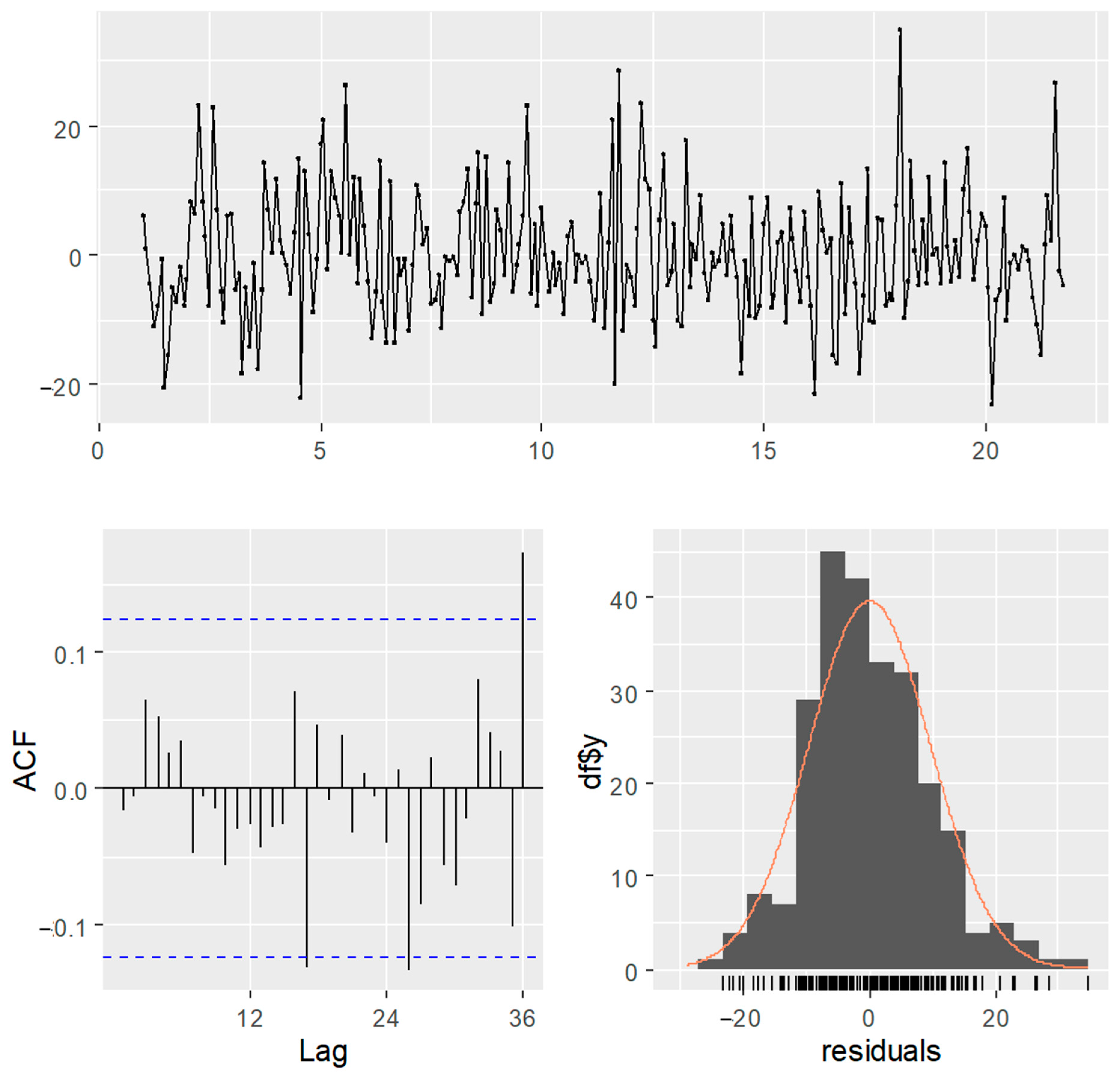12] model, which includes three key components: the residual time series plot (top), the autocorrelation function (ACF) of residuals (bottom left), and a histogram of residuals with a density overlay (bottom right). The residual time series plot shows that the residuals fluctuate randomly around zero without any discernible systematic patterns or trends, indicating that the model has effectively captured the underlying structure of the data. The ACF plot reveals no significant autocorrelations at any lag, as all bars remain within the confidence bounds, suggesting that the model has adequately accounted for temporal dependencies, including seasonal effects. Additionally, the histogram of residuals exhibits a roughly symmetric distribution that aligns well with the normal density curve, supporting the assumption of normality. Collectively, these diagnostics confirm that the SARIMAX (0,0,0) (2,0,0) [