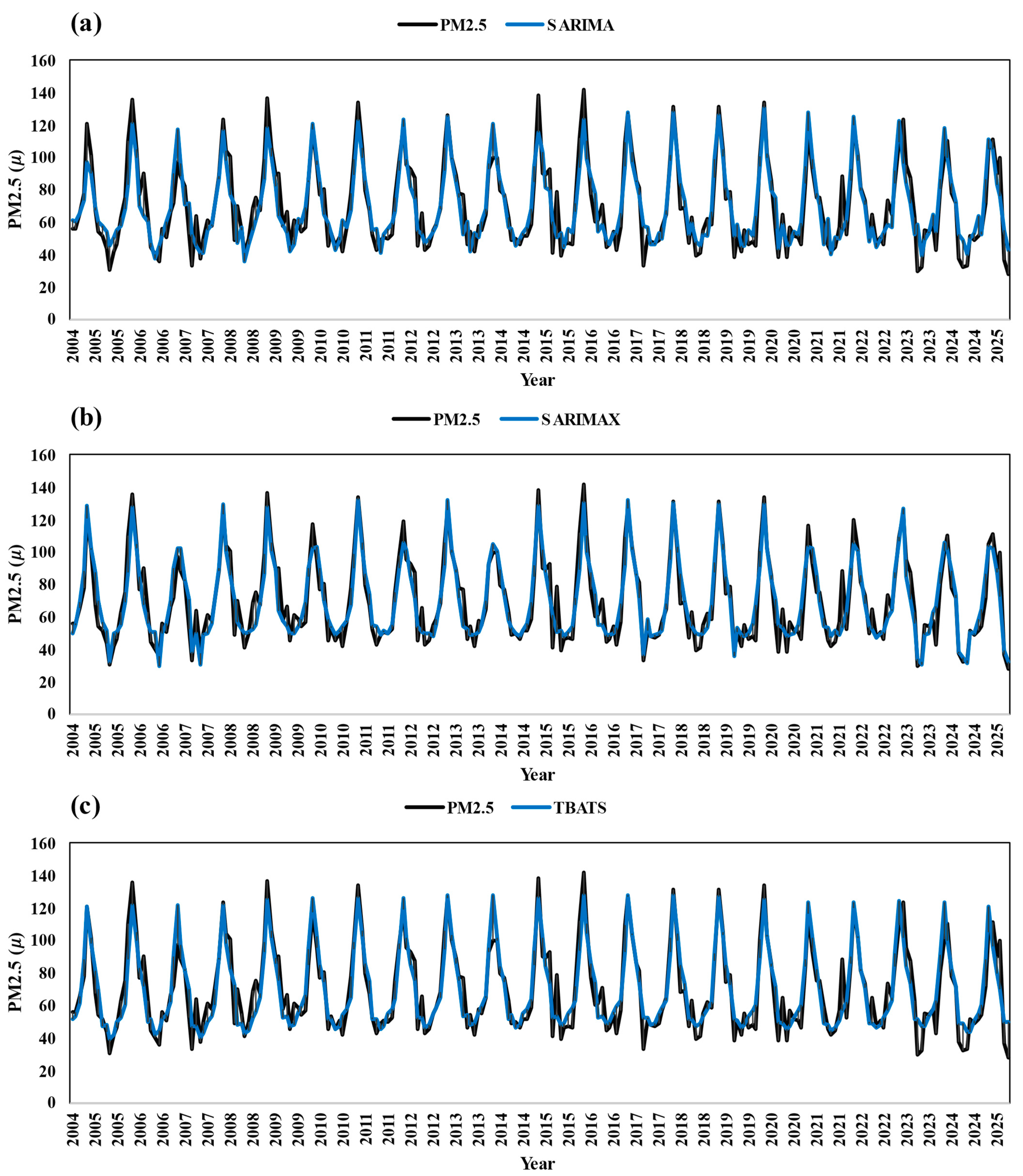Collectively, these results indicate that the SARIMAX model with Fourier terms provides the most robust fit for the monthly PM2.5 series in Zabol, outperforming both the classical SARIMA and TBATS models in terms of statistical fit and residual diagnostics.