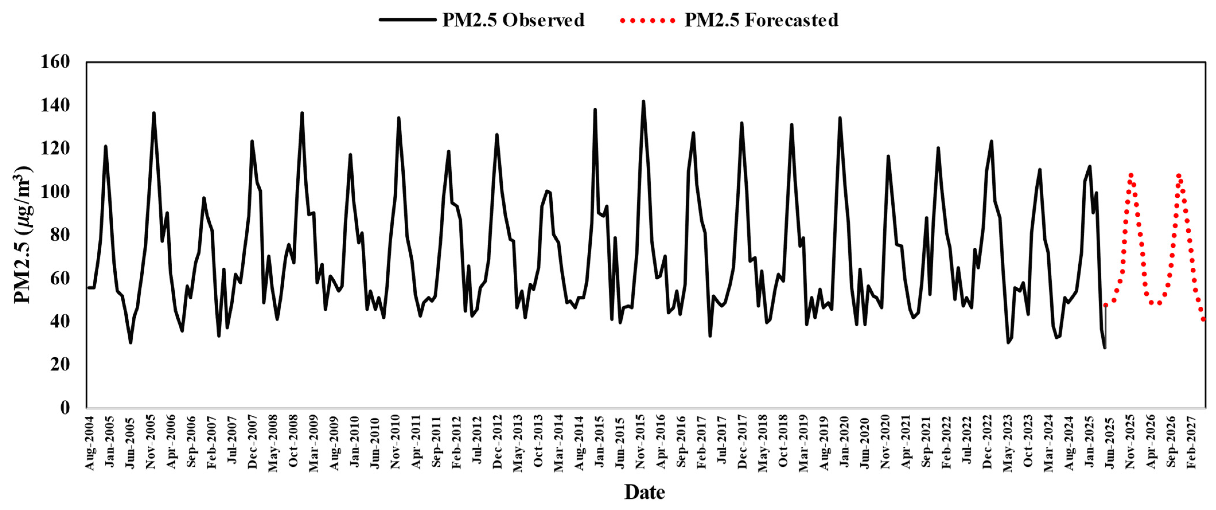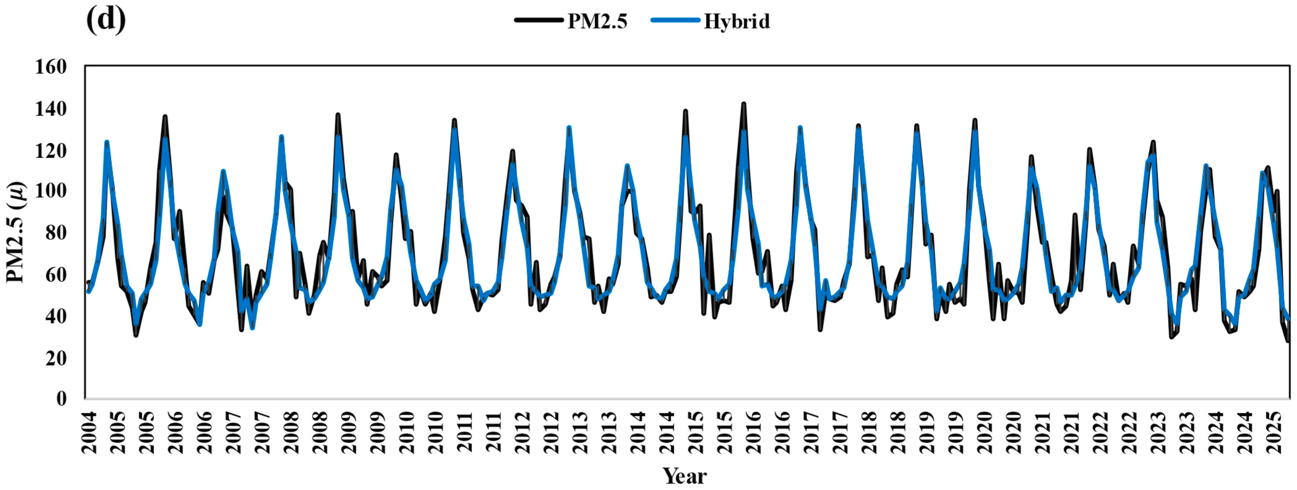 2.5 concentrations in Zabol from 2004 to 2027, generated by the Hybrid model. As clearly shown, the model has successfully captured the seasonal pattern of the historical data. Both the short-term and long-term forecasts (up to 2027) follow the anticipated trends with reasonable accuracy, and the forecasted peak values for the upcoming periods (such as 2026–2027) appear to be more conservative and lower compared to the past observed peaks (like in 2014–2015). Overall, the model demonstrates stable and reliable performance not only for short-term forecasting and seasonal planning but also for the long-term outlook up to 2027. The figure effectively demonstrates the model’s strength in capturing and continuing the seasonal variation pattern.