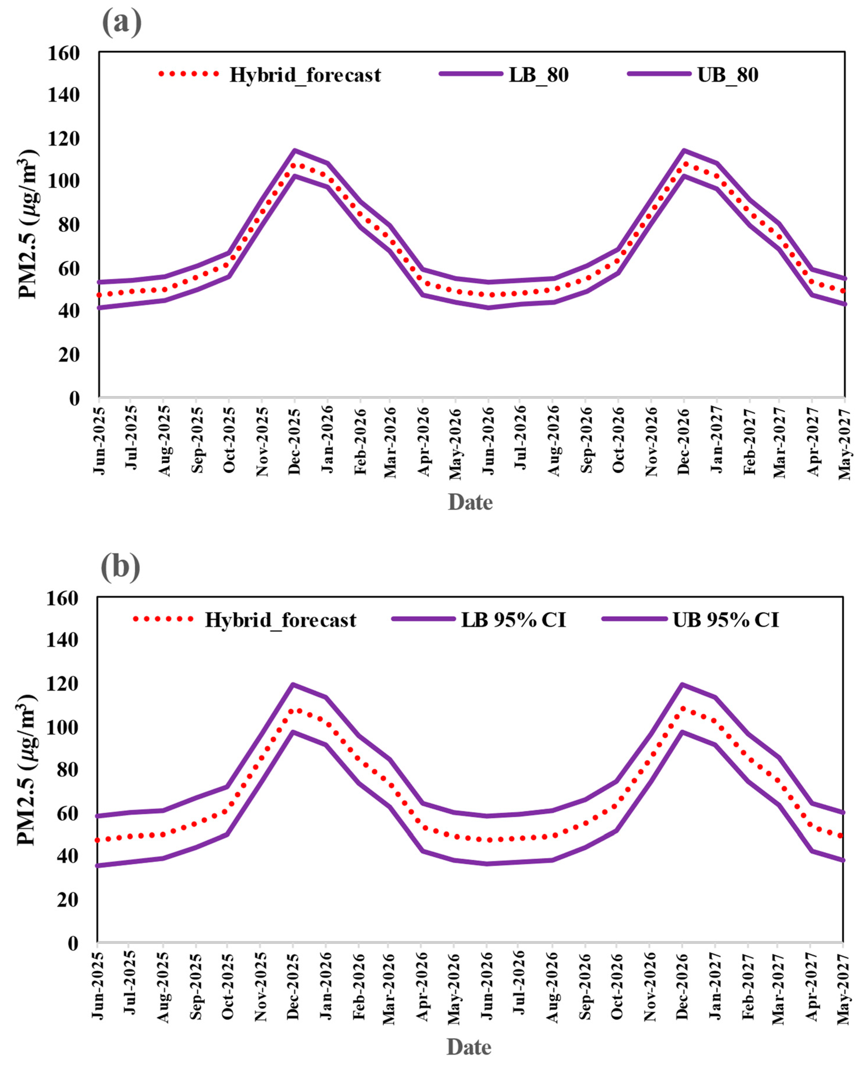 2.5 concentration forecasts generated by the hybrid model with an 80% confidence interval. The red line represents the mean predicted values for each month, while the blue shaded band around this line indicates the 80% confidence interval range defined by the lower bound (LB_80) and upper bound (UB_80).
