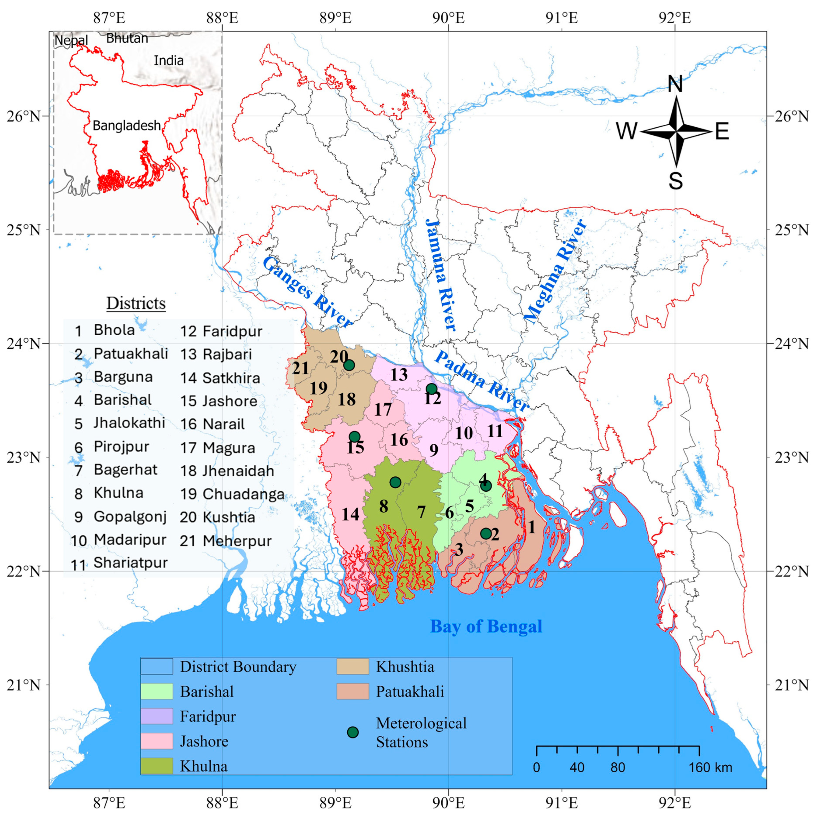 - Jihan, M.A.T.; Popy, S.; Kayes, S.; Rasul, G.; Maowa, A.S.; Rahman, M.M. Climate Change Scenario in Bangladesh: Historical Data Analysis and Future Projection Based on CMIP6 Model. Sci. Rep. 2025, 15, 7856. [Google Scholar] [CrossRef]