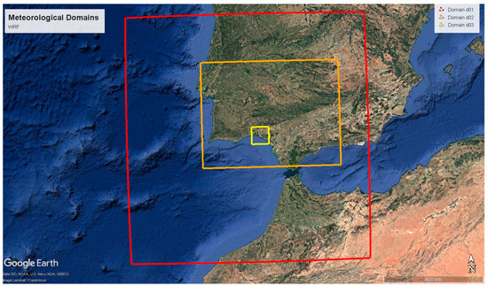 The modelling domains used in this study are shown in Figure 2. The parent domain (d01), with a grid point spacing of 9 km and aimed to capture synoptic features and general circulation patterns, is centred at 37.14° N, 7.38° W and encompasses the southwestern Iberian Peninsula, northern Morocco, and adjacent marine areas. It spans approximately 900 × 909 km2 (west–east × south–north). The first nested domain (d02), at 3 km resolution, covers southern Portugal and western Andalusia (507 × 390 km2), while the innermost domain (d03), with a grid point spacing of 1 km, focuses on the Huelva region (64 × 64 km2). Domain configuration follows the approach described in [42].