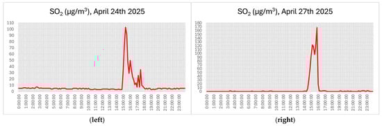 Evolution of 10 min SO2 concentrations during the hours preceding and following selected episodes: Episode 1 (left), Episode 2 (right). Time is expressed in local time (UTC + 2).