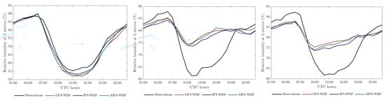 The analysis has been carried out over domain d03, the innermost modelling domain (Figure 2). Table 2 presents the statistical results for each meteorological parameter along with the corresponding benchmarks. For wind speed and direction, calms below 1 m s−1 were excluded from the analysis, as wind direction is unreliable under such conditions [44,68]. All statistics were computed using hourly data from both model outputs and observational records, and performance was assessed for 24 h, 48 h, and 72 h forecasts.