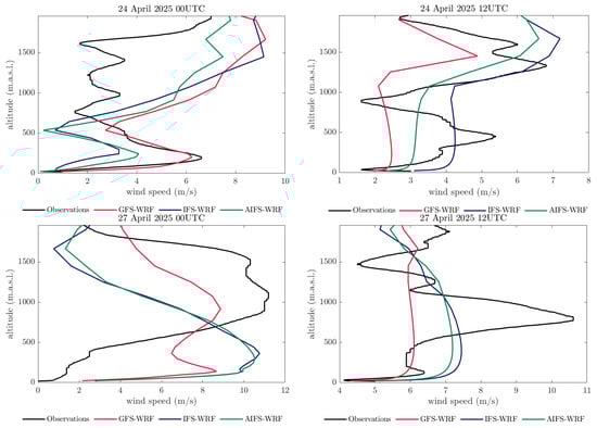 AEMET carries out automated radiosonde launches twice a day, at approximately 00 and 12 UTC (corresponding to local time UTC + 2 for the selected episodes). These measurements provide detailed information on key atmospheric variables, including temperature (°C), dew point (°C), relative humidity (%), wind speed (m s−1), wind direction (°), and atmospheric pressure (hPa), spanning from the surface up to an altitude of approximately 30 km [63].
