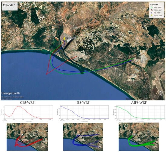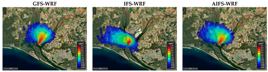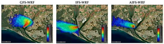 Backward trajectory analysis was complemented with dispersion modelling. The aim of the modelling dispersion analysis is to analyse how the use of GFS/IFS/AIFS affects the HYSPLIT forecasts using an illustrative emission. For this purpose, a hypothetical point emission source was defined at coordinates 37.22° N and 6.95° W (Figure 1), located at 10 m.a.g.l., with an emission rate of 40 g/s for one hour starting at 14:00 UTC. SO2 was, again, used as the tracer pollutant. This setup does not correspond to a real emission event; its sole purpose was to evaluate the sensitivity of dispersion modelling to the different WRF meteorological configurations. The point emission source is located in the industrialised area of Huelva [56].