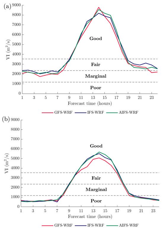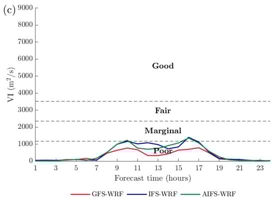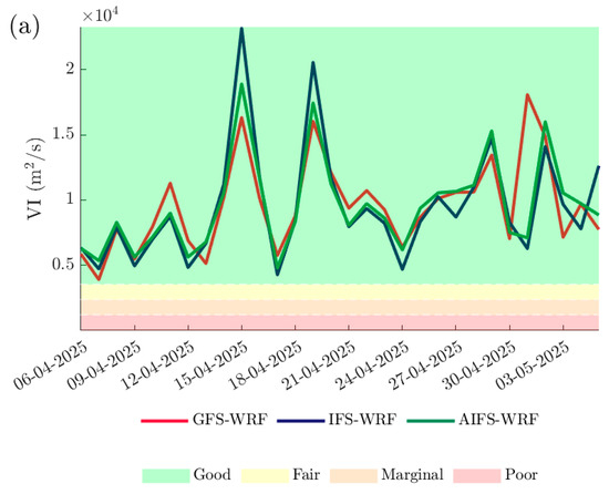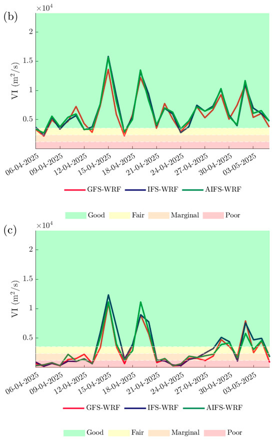 - A comparison of the ventilation index (VI). VI values were calculated using different global model initialisations to assess their influence on atmospheric dispersion potential.