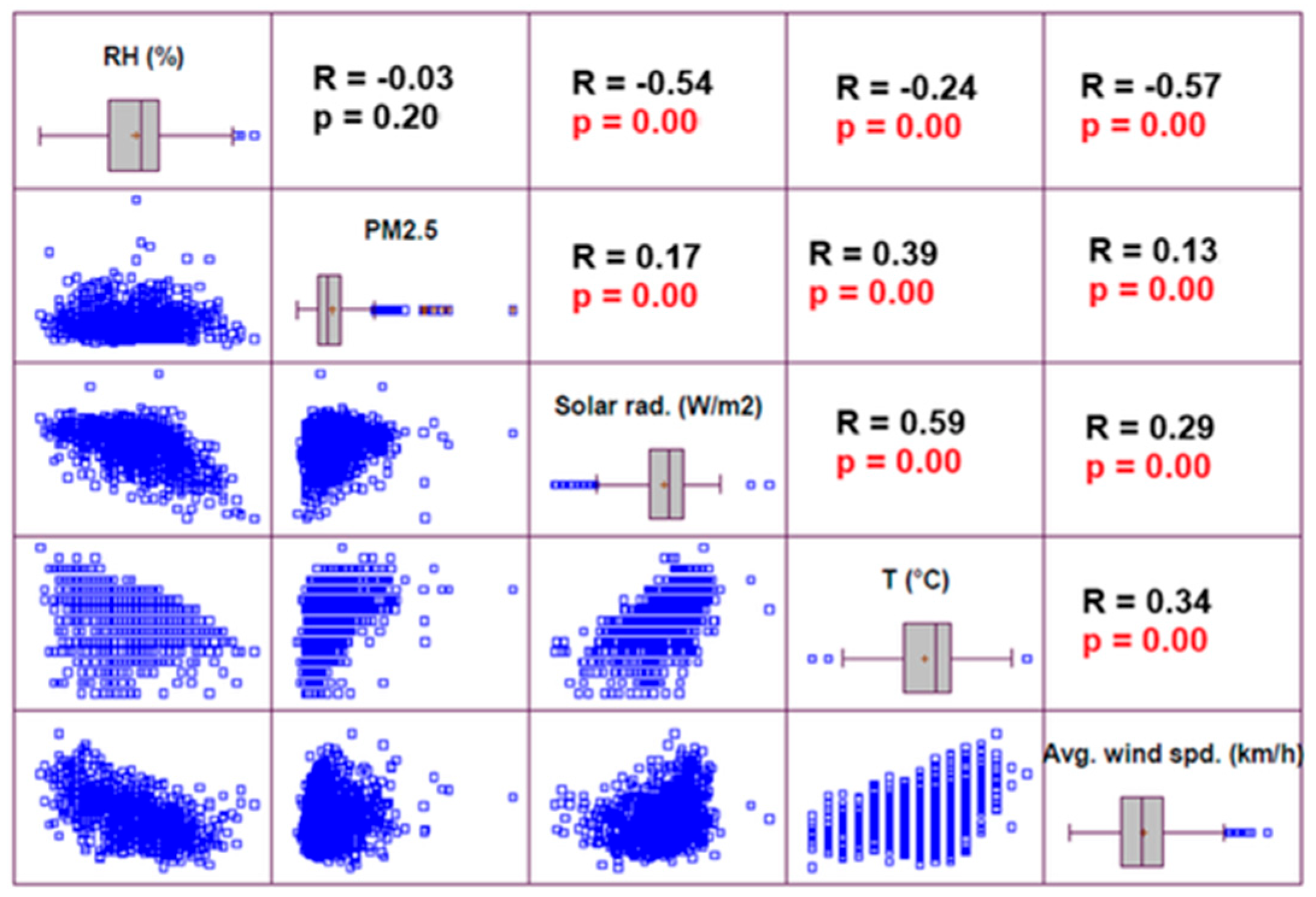 | Relative humidity | H = 30.44 p-value = 3.42 × 10−8 | H = 31.48 p-value = 2.01 × 10−8 |
