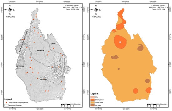 K is the soil erodibility factor, which quantifies the susceptibility of the soil to erosion. It is usually regarded as the amount of soil loss per unit erosive force []. It accounts for factors such as soil texture, organic matter content, and structure. Due to limited data on soil physical and chemical properties and the limited resources to generate those data, a texture-based estimation approach was used to derive the K-factor (Table 1). This method, though simplified, has been widely applied in data-limited basins to represent spatial variability in soil erodibility. More comprehensive approaches, such as those incorporated in USLE-K, RUSLE2-K, EPIC-K, and Dg-K algorithms [], require input variables that were unavailable for the present study. Soil texture data collected across the watershed (Figure 2) were interpolated using ordinary kriging to produce a continuous soil texture map, which has been widely applied in soil property mapping studies [,]. The locally derived interpolation captures site-specific variability more accurately than global datasets like SoilGrids, which often generalize local heterogeneity. A total of 35 soil sampling points were used for kriging interpolation, providing adequate spatial coverage; however, minor uncertainty may still result from variations in sample spacing and terrain complexity. Although a kriging variance map was not produced due to data and processing limitations, the interpolation was designed to capture local spatial variability effectively.