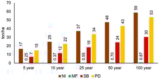 Average soil erosion values (ton/ha) of different Rainfall Return Period Scenarios (5, 10, 25, 50, 100 year) and different Land cover Scenarios (No Reforestation Intervention—NI, Maximum Forest Cover—MF, Slope-Based Land use approach—SB, and Reforestation on Public Domain—PD).