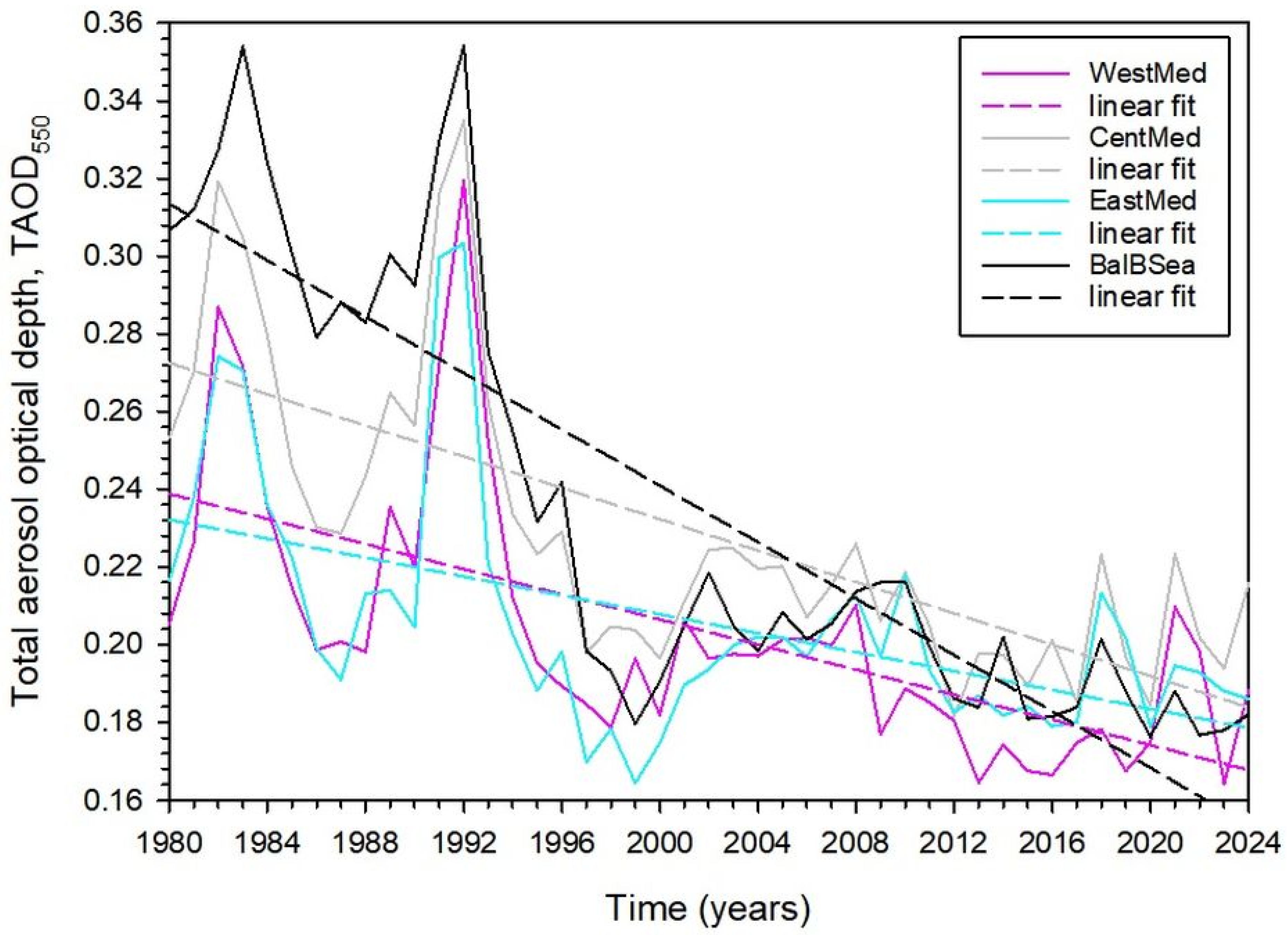 - The linear regression fits to TAOD550 as a function of time (see Figure 3) give the following trends: −0.017/decade (WestMed); −0.024/decade (CentMed); −0.013/decade (EastMed); and −0.037/decade (BalBSea). All trends are negative with a greater slope over BalBSea and a smaller slope over EastMed. Kambezidis [31] found a trend over the entire Mediterranean in the period 1980–2022 equal to −0.018/decade, close to the average of the above four TAOD550 slopes (−0.023/decade). Chiapello et al. [86] found a TAOD550 trend of −0.06/decade over the Western Mediterranean in the period 2005–2013, which is almost three times higher than the corresponding average value in the present work. Shaheen et al. [60] found a TAOD550 trend over EastMed of ≈−0.002/decade from MERRA-2 in the period 1980–2018, ten times lower than the average value in the present work. These varying slopes among different studies are due to the different periods examined, the source of the data used, and the areas covered; they, therefore, reflect the need to standardise the whole procedure for a more comparable way among various works.