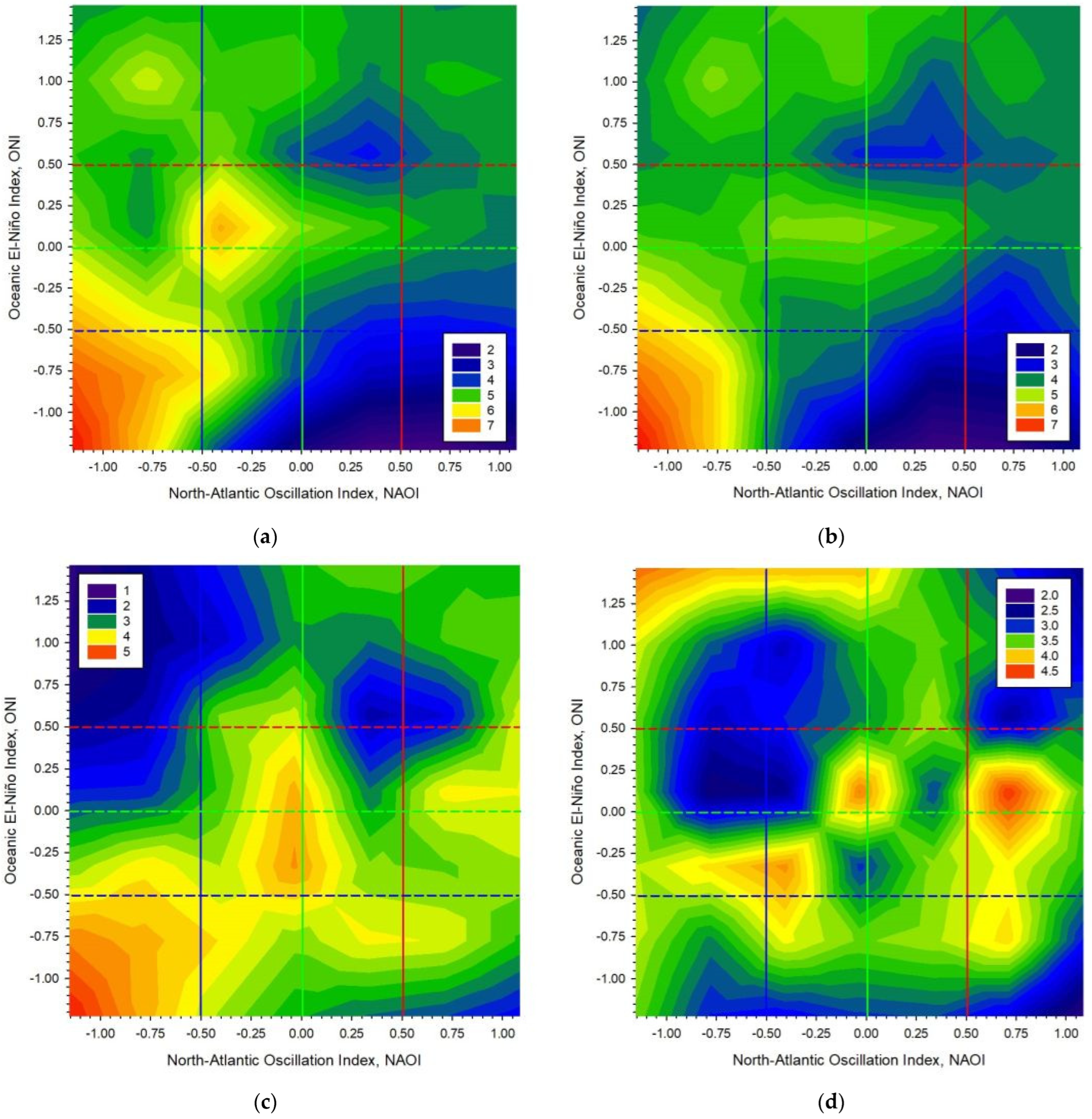 | NAOI | Index of the North Atlantic Oscillation: a measure of the surface sea-level pressure difference between the subtropical High at Azores and the subpolar Low over Iceland. A neutral zone similar to that for ONI is established here. Therefore, it makes sense to use the same delimitation as ONI; neutral NAO events in the band (−0.5, +0.5), positive NAO cases for NAOI ≥ +0.5, and negative NAO events for NAOI ≤ −0.5. |